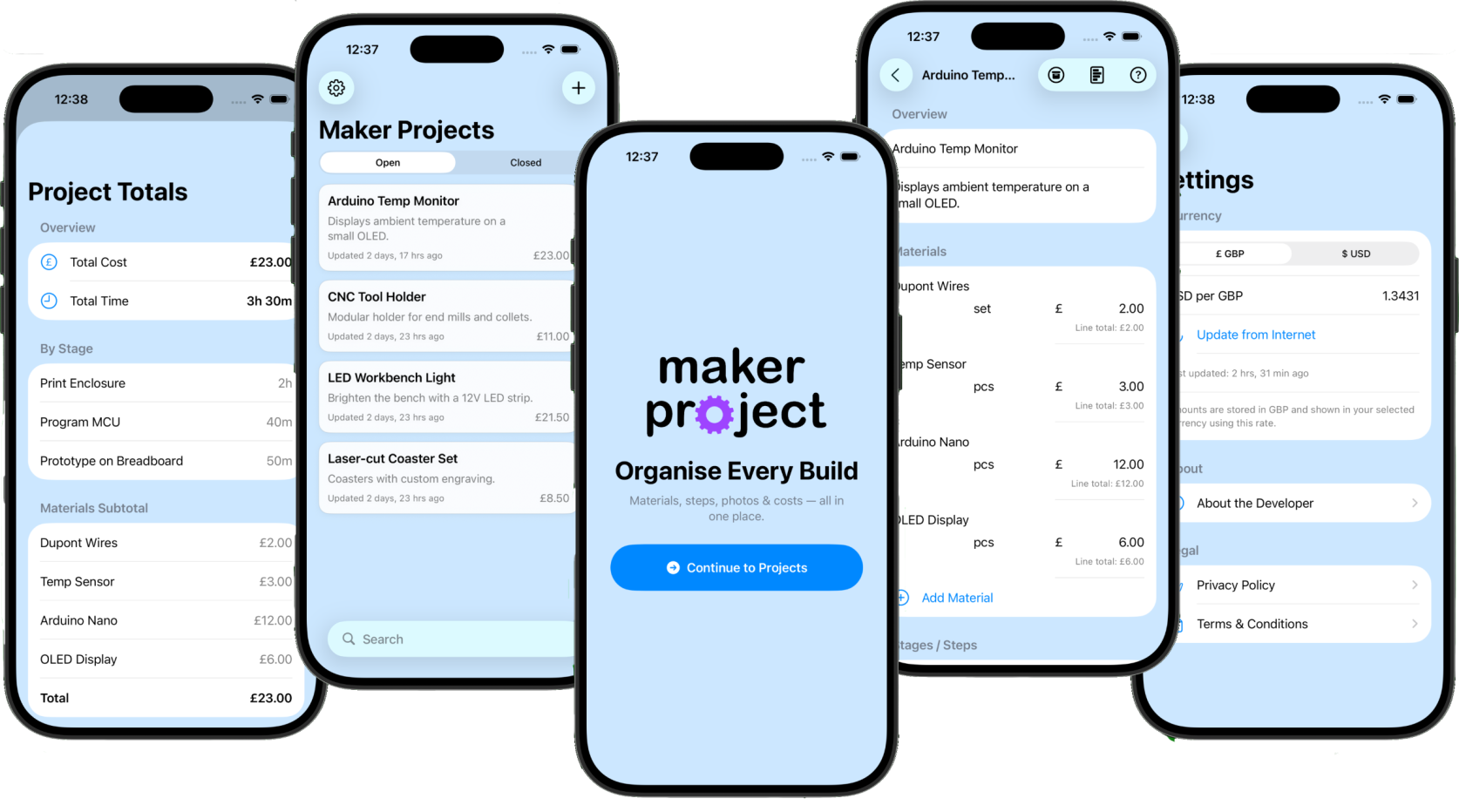 it’s a lightweight project journal for makers that lets you create projects, add materials with quantity, unit, and unit cost, and track your build in clear stages with notes.